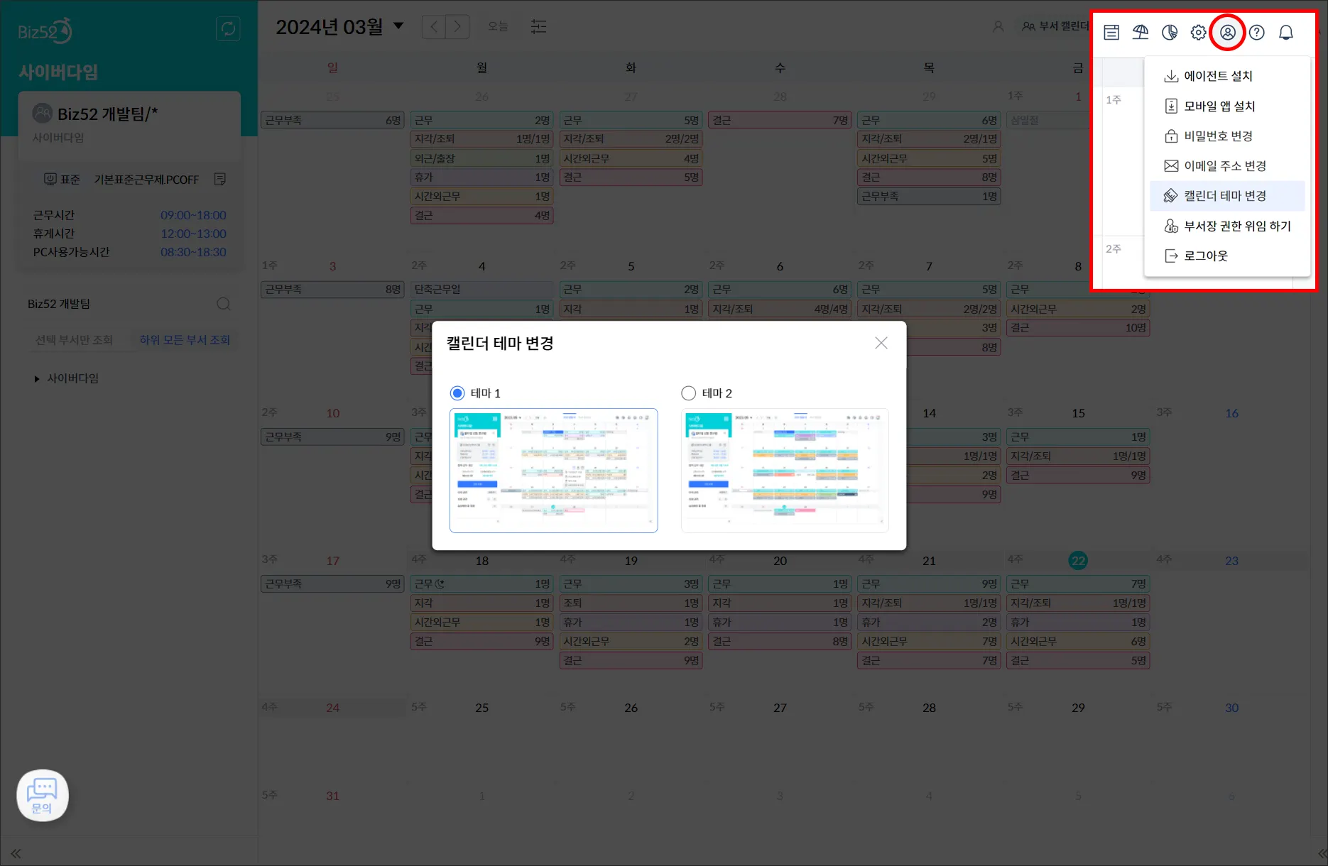 캘린더 우측 상단 ‘MY메뉴’의 ‘캘린더 테마 변경’ 버튼을 통해 본인이 더 선호하는 테마를 선택할 수 있습니다.
