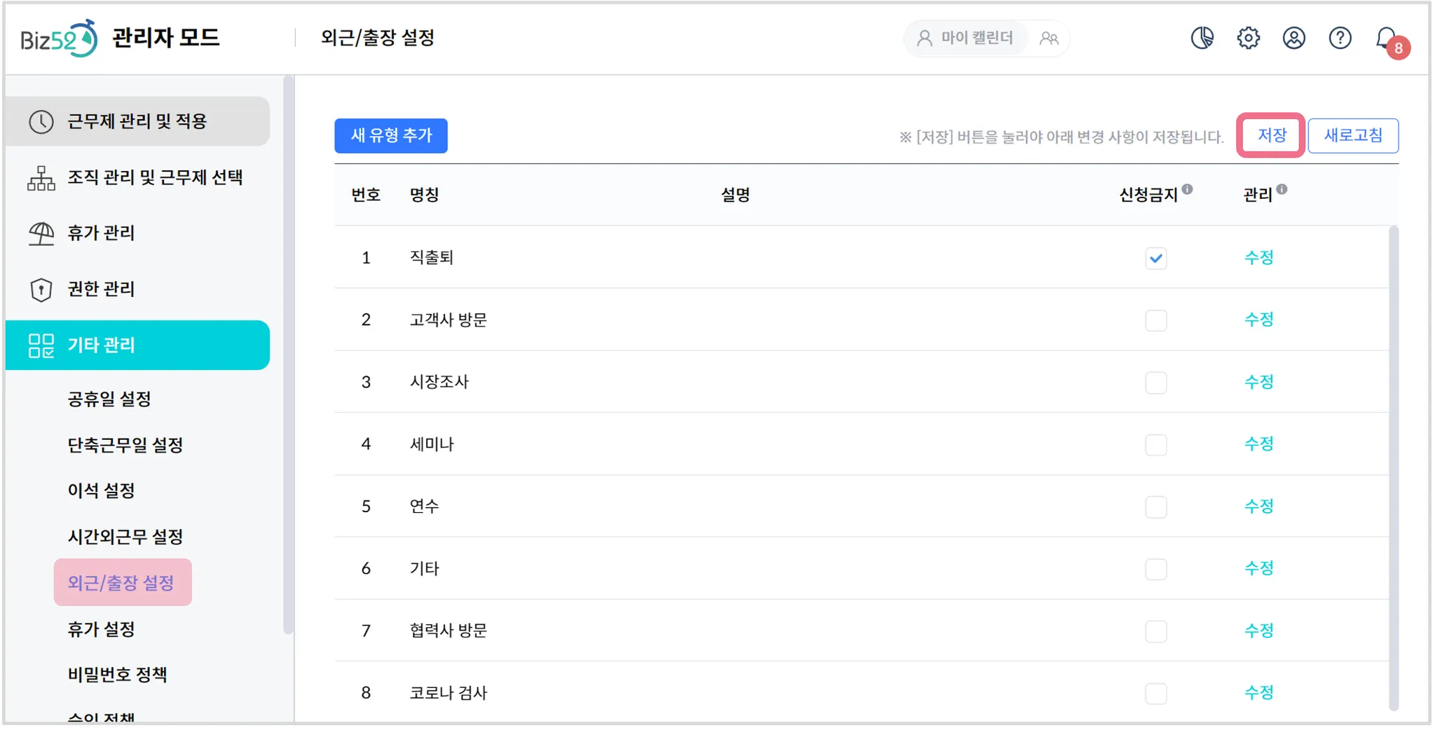 외근/출장 유형 설정으로 근무 중 발생하는 다양한 사유의 외근과 출장을 항목별로 간편하게 관리할 수 있습니다. 관리자 모드>기타 관리>외근/출장 설정 에서 설정해보세요!