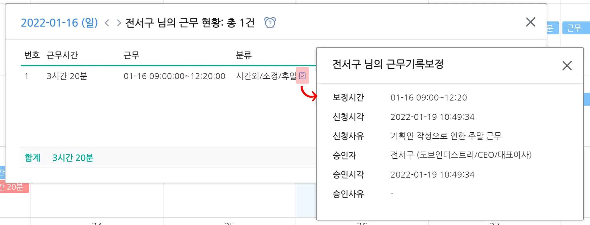 웹 캘린더의 상세 근무 현황 창에서 서류모양 근무기록보정 아이콘을 클릭하면 새 창으로 신청시각, 신청사유 등 근무기록보정 상세 내용을 확인할 수 있습니다.