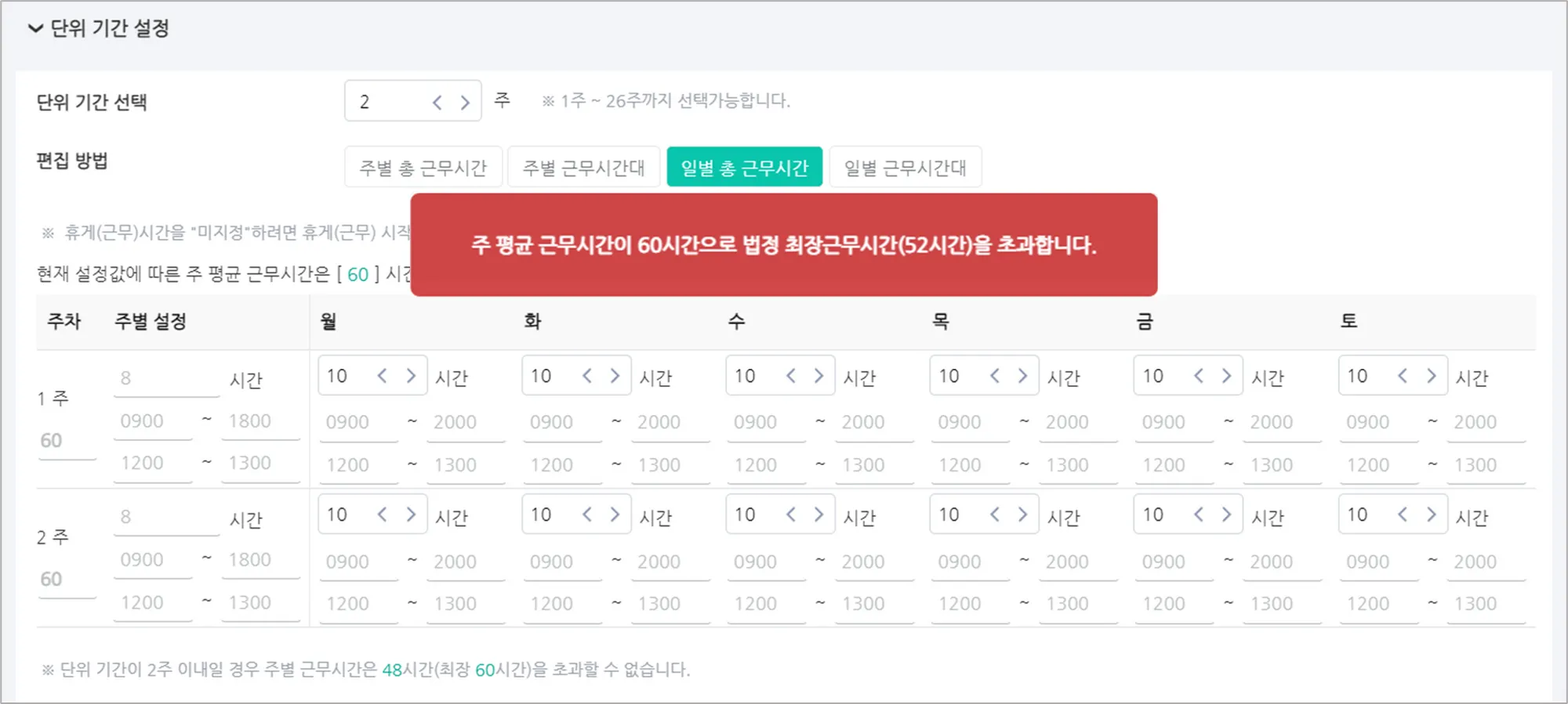 ※주 평균 근무시간이 52시간을 초과할 경우 다음과 같은 경고창이 발생하며, 근무제가 저장되지 않습니다.