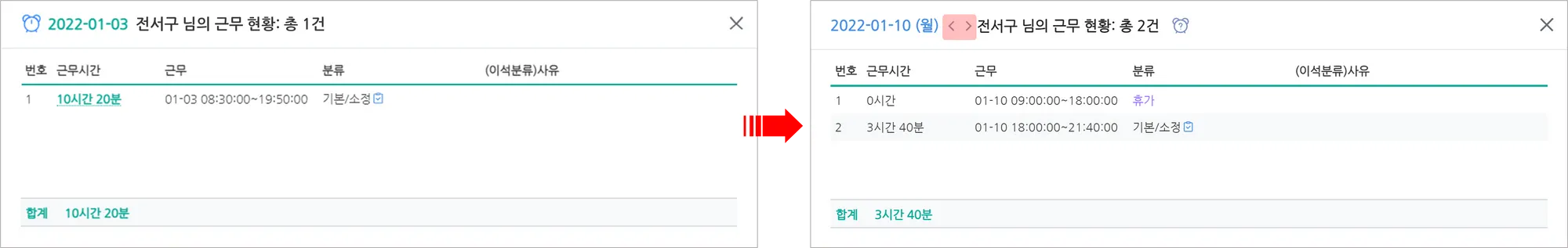 [<] ,[>]버튼을 각각 클릭 시 기준일의 전날과 다음날의 근무 현황으로 이동할 수 있습니다.