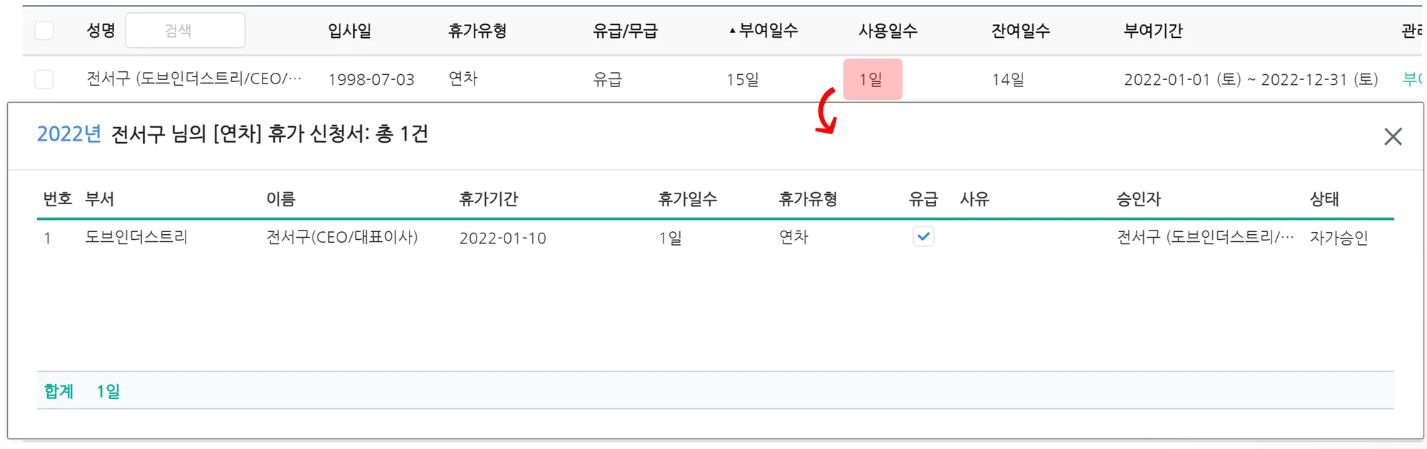 관리자 모드 > 휴가 부여에서 사용자의 휴가 [사용일수]를 클릭하면 새 창으로 해당 사용자의 휴가 신청서를 조회할 수 있습니다.