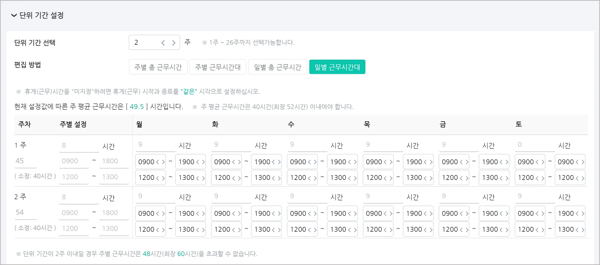 기존, 주 소정근무시간이 40시간을 초과하면 근무제가 저장되지 않았는데요, 이번 업데이트로 주 평균 소정근무시간이 48시간 미만, 주 근무시간이 52시간 미만이라면 연장근무시간을 포함하여 근무제를 생성할 수 있게 되었습니다.