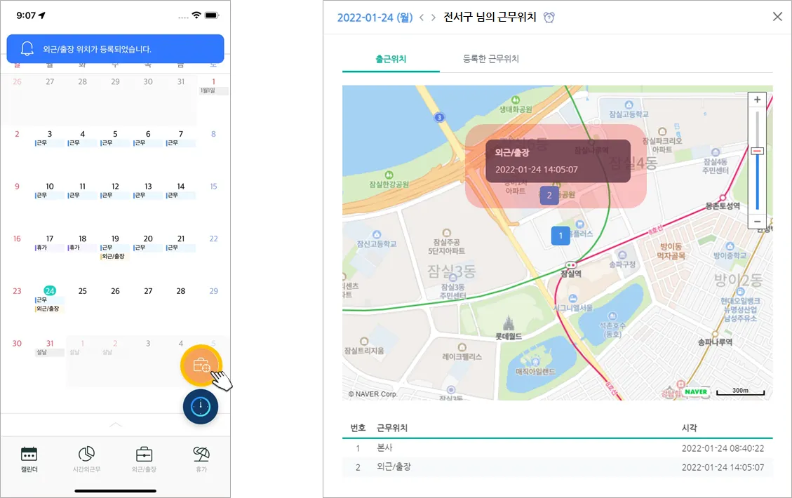 △ 외근/출장지 도착 버튼 클릭                                △ 캘린더의 근무 위치에 내 외근/출장지 위치 등록