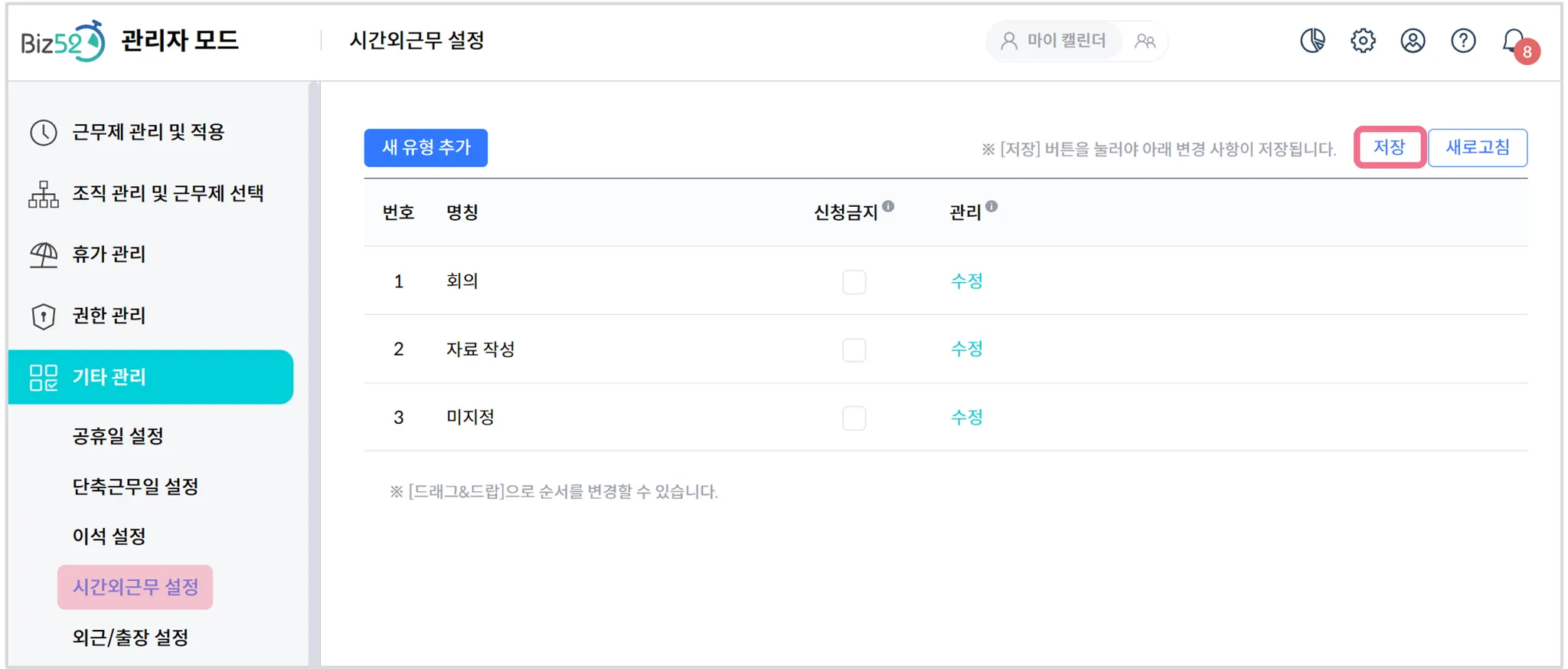 우리 회사에 필요한 새로운 유형을 추가하고 싶으시다면, 목록의 좌측 상단에 있는 새 유형 추가를 클릭하세요! 추가하고자 하는 유형의 이름을 입력한 뒤 확인을 누르고 저장을 누르면 추가됩니다.