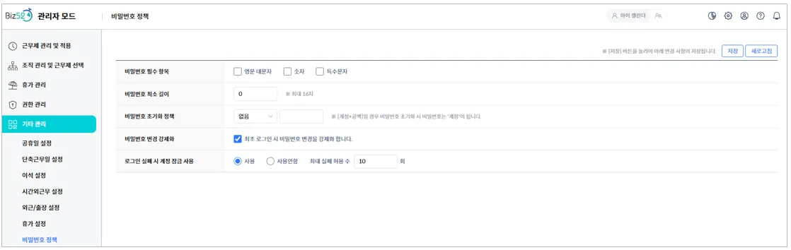 사용자가 Biz52에 최초 로그인 시, 초기 설정된 비밀번호를 반드시 변경하도록 설정합니다.