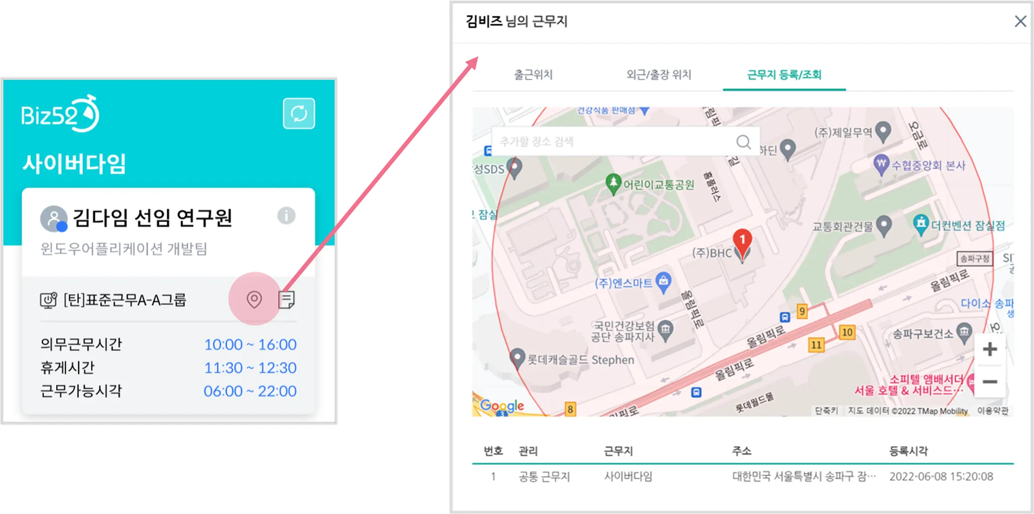 비즈52의 모바일 앱에서 위치 확인 기능을 지원합니다. 근무 위치를 등록하고 등록한 근무지 반경에서만 출퇴근 처리가 가능해 부정 출퇴근 기록을 사전에 방지하고 정확한 근태 기록이 가능합니다.