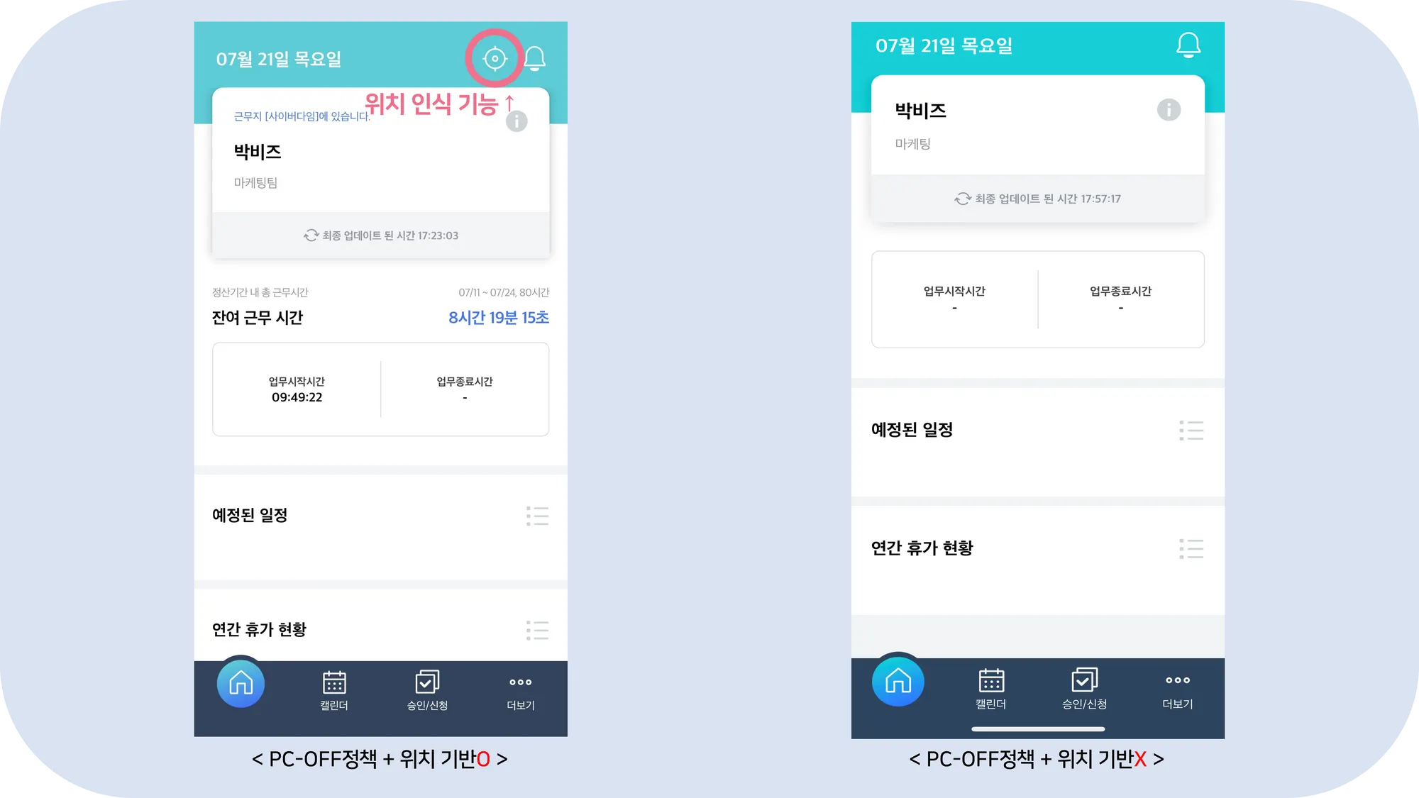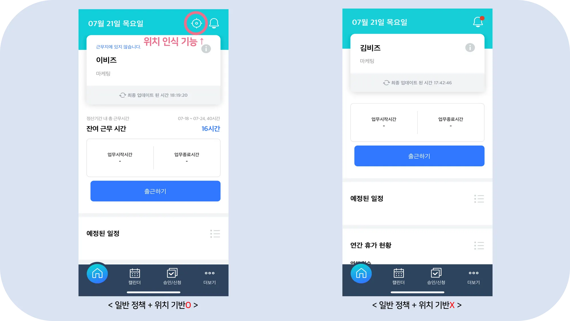 프리미엄과 달리, 초기 화면에 접속 시 출근하기 혹은 퇴근하기 버튼을 확인할 수 있죠!