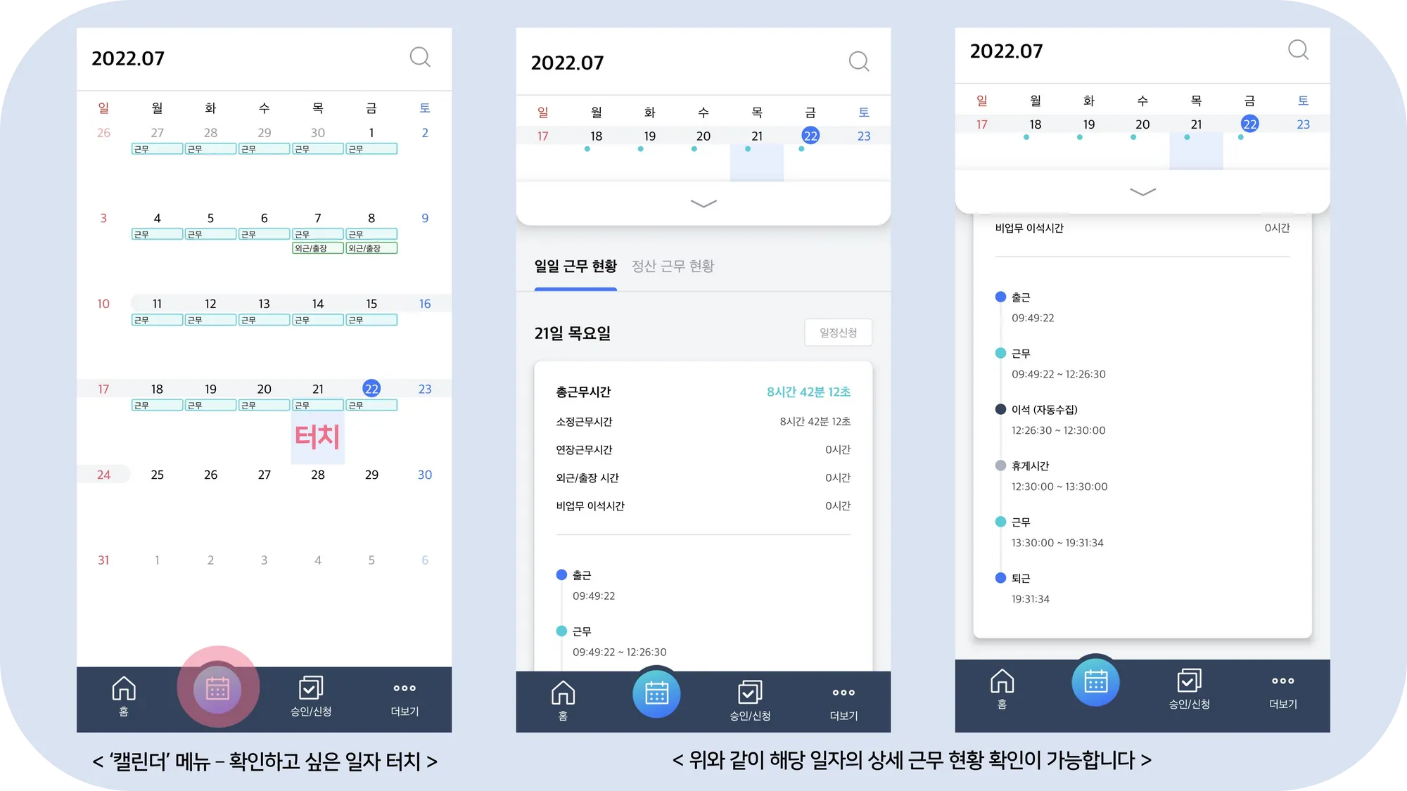 웹 캘린더에 접속하지 않아도, 모바일 Biz52에서 일별 상세 근무 현황 확인이 가능합니다.
