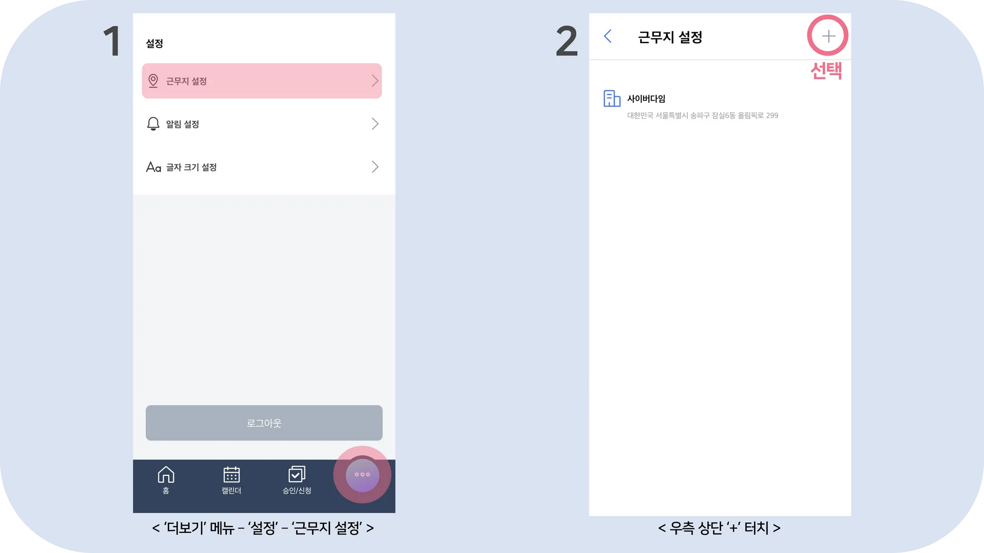 ‘더보기’ 메뉴 제일 상단에 있는 근무지 설정에 들어가면 새로운 근무지 등록이 가능하며 언제든지 수정 혹은 삭제할 수 있습니다.