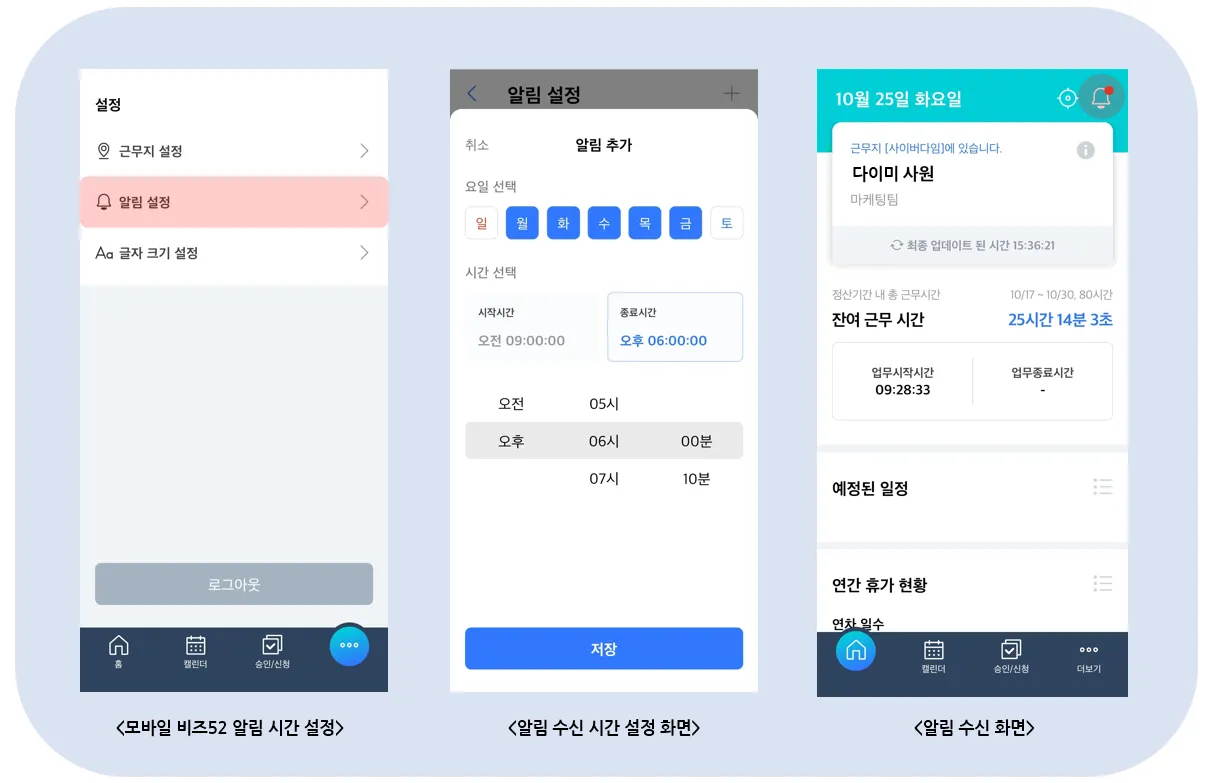 아이콘 알림 내역을 확인할 수 있습니다. 게다가 “저는 근무시간 동안만 비즈 알림 받고 싶어요!” 하시는 분들을 위해 알림을 받을 시간대를 따로 설정할 수 있습니다.