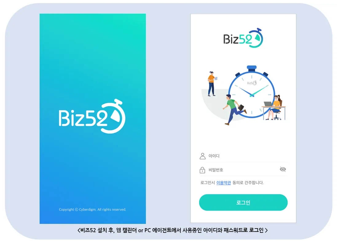 비즈52 앱 설치 후, 아래와 같은 화면이 보여집니다. 비즈52 웹 캘린더 또는 PC 에이전트와 동일한 아이디와 패스워드로 로그인하면 완료-!