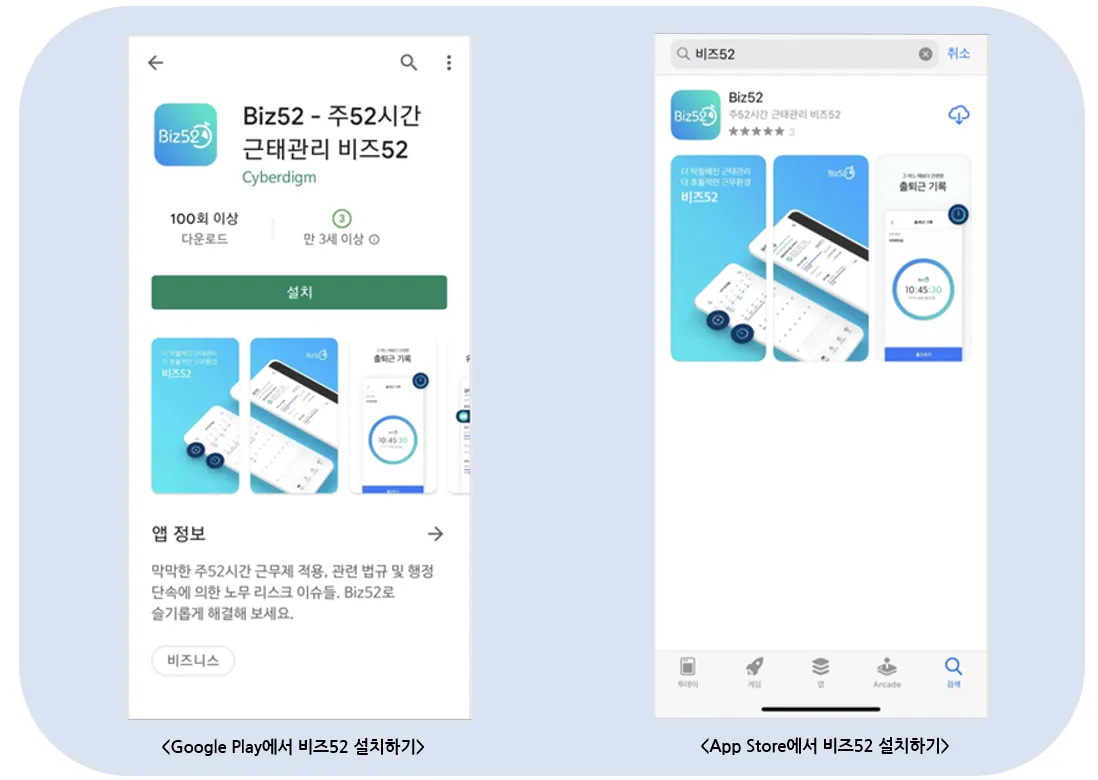 안드로이드 사용자라면 Google Play에서, iOS 사용자라면 App Store에서 'Biz52 또는 비즈52'를 검색해보세요.(●'◡'●)