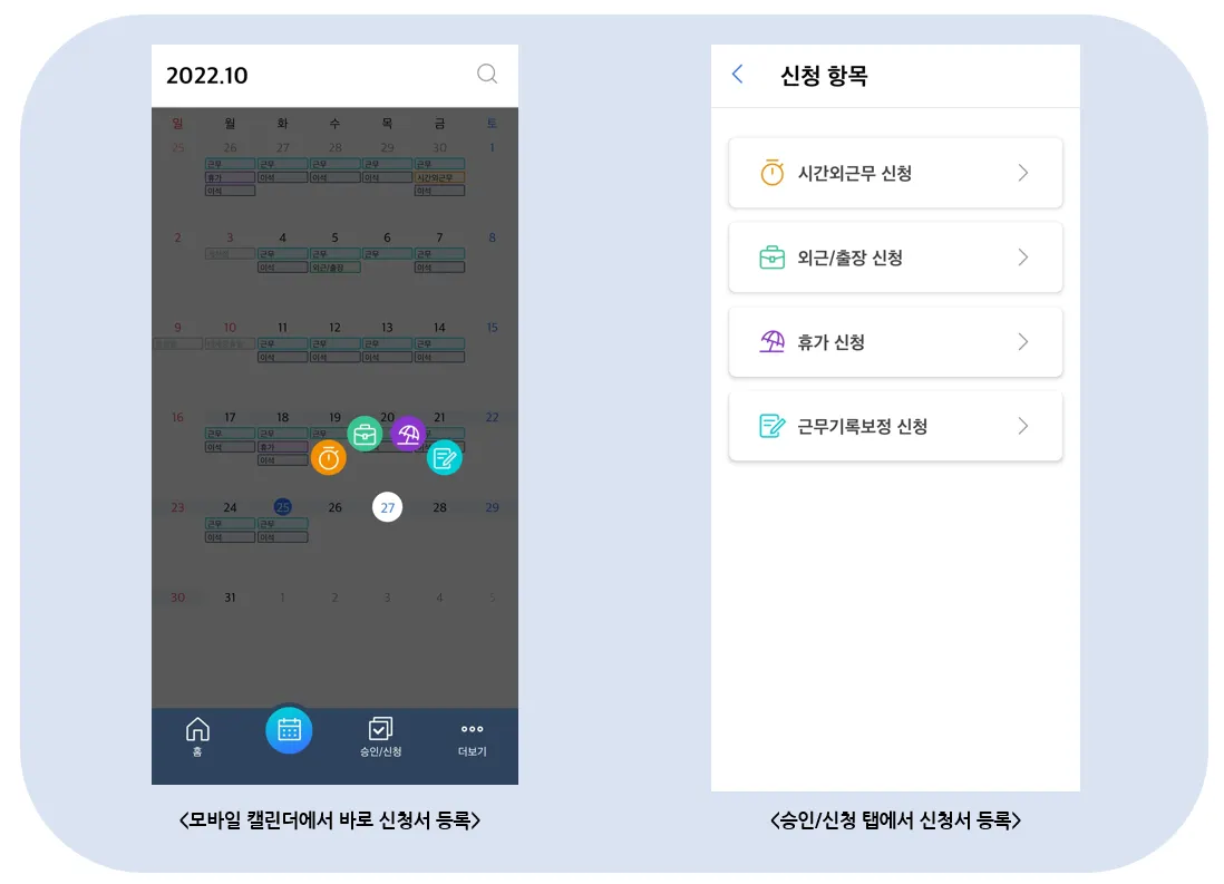 모바일 앱을 통해 출퇴근을 기록하고 근무 현황 조회 및 휴가 · 시간외근무 · 외근/출장· 근무기록 보정 신청/승인 모두 가능합니다!