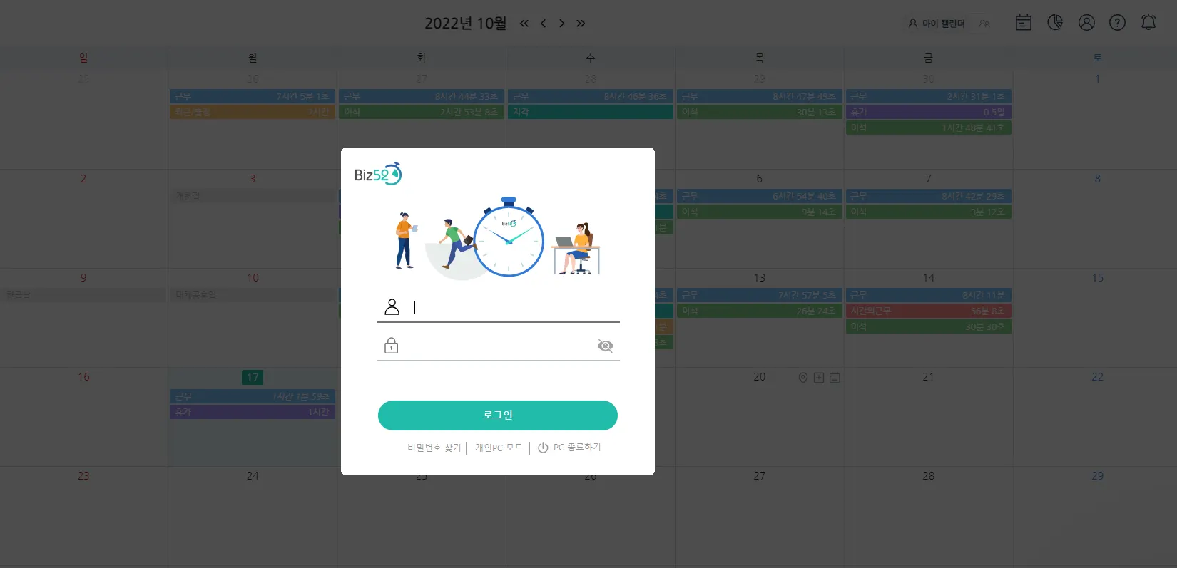 PC사용을 위해서는 로그인이 필수! 로그인한 시간부터는 근무 시간으로 자동 기록됩니다.