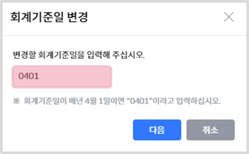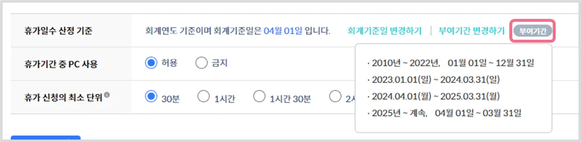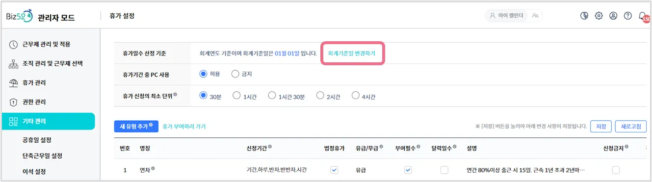 휴가일수 산정 기준은 기본적으로 1월 1일이나, 회사 정책에 따라 회계기준일을 변경하고 싶을 경우 관리자모드>기타 관리>휴가 설정에서 변경할 수 있습니다.