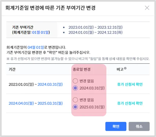 -“휴가 신청서 취소” 후 ”부여기간 변경하기” 버튼을 통해 다시 부여기간을 재지정할 수 있습니다.