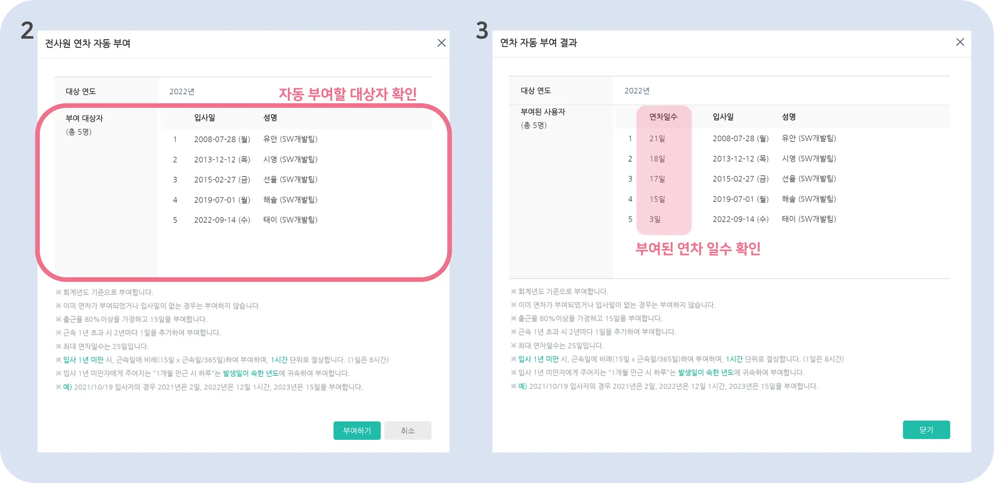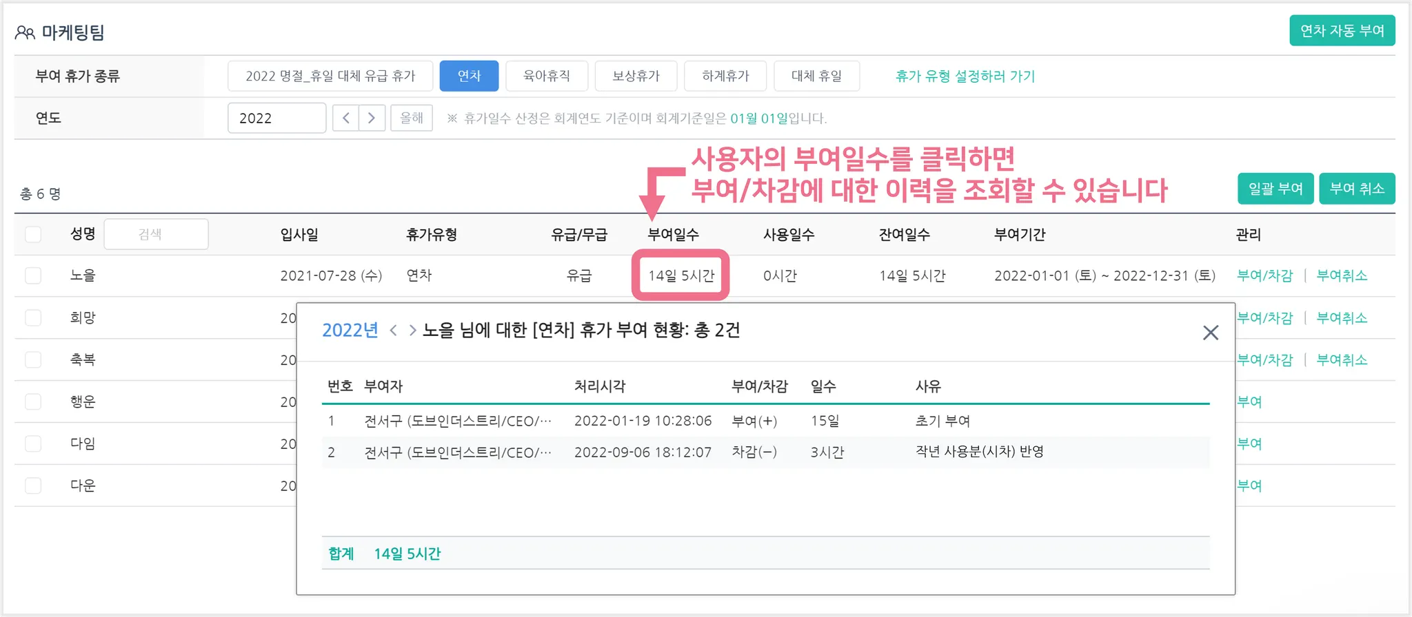 부여/차감에 대한 상세 내역은 사용자의 부여 일수를 클릭하면 확인할 수 있습니다.