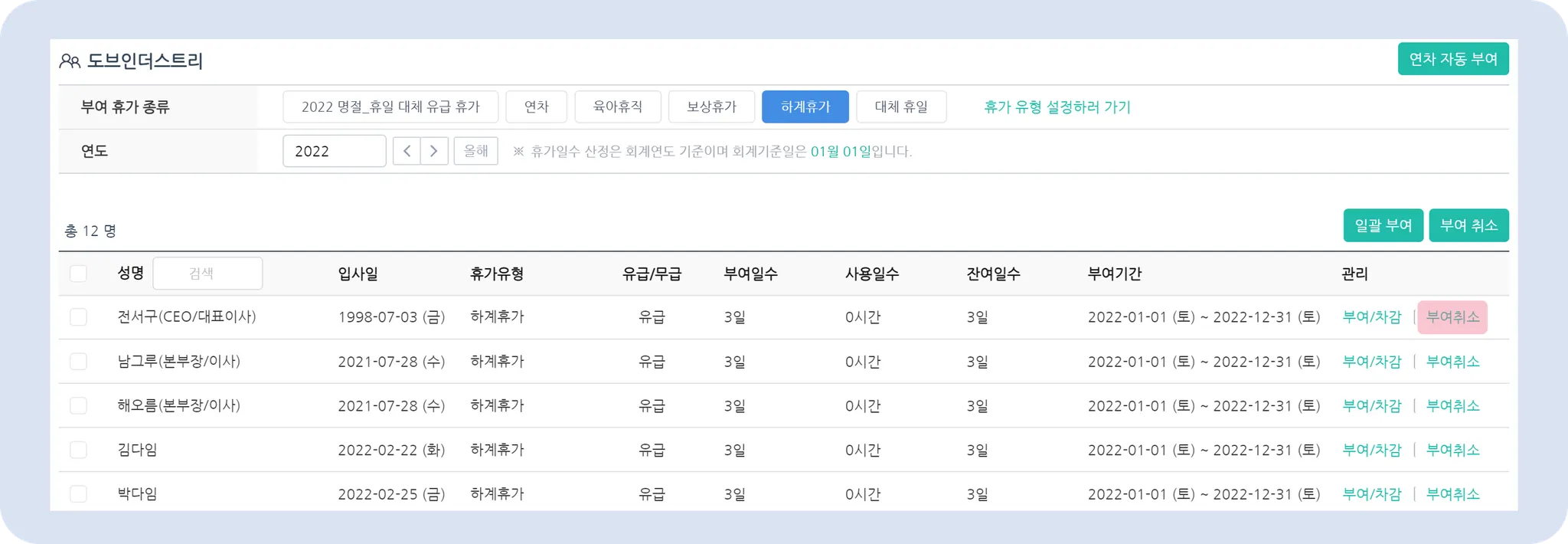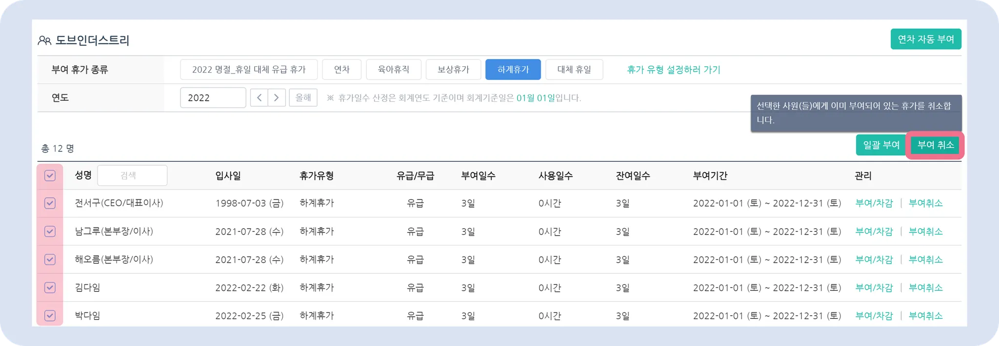 사용자에게 부여한 휴가를 일괄 부여 취소할 수 있습니다.