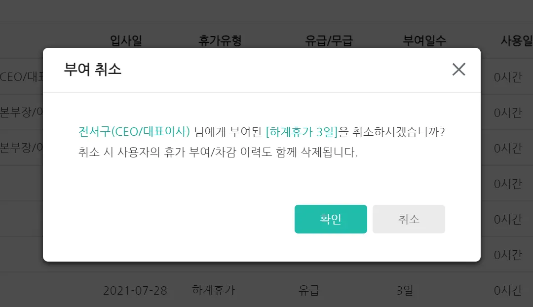사용자에게 부여한 휴가를 취소할 수 있습니다.