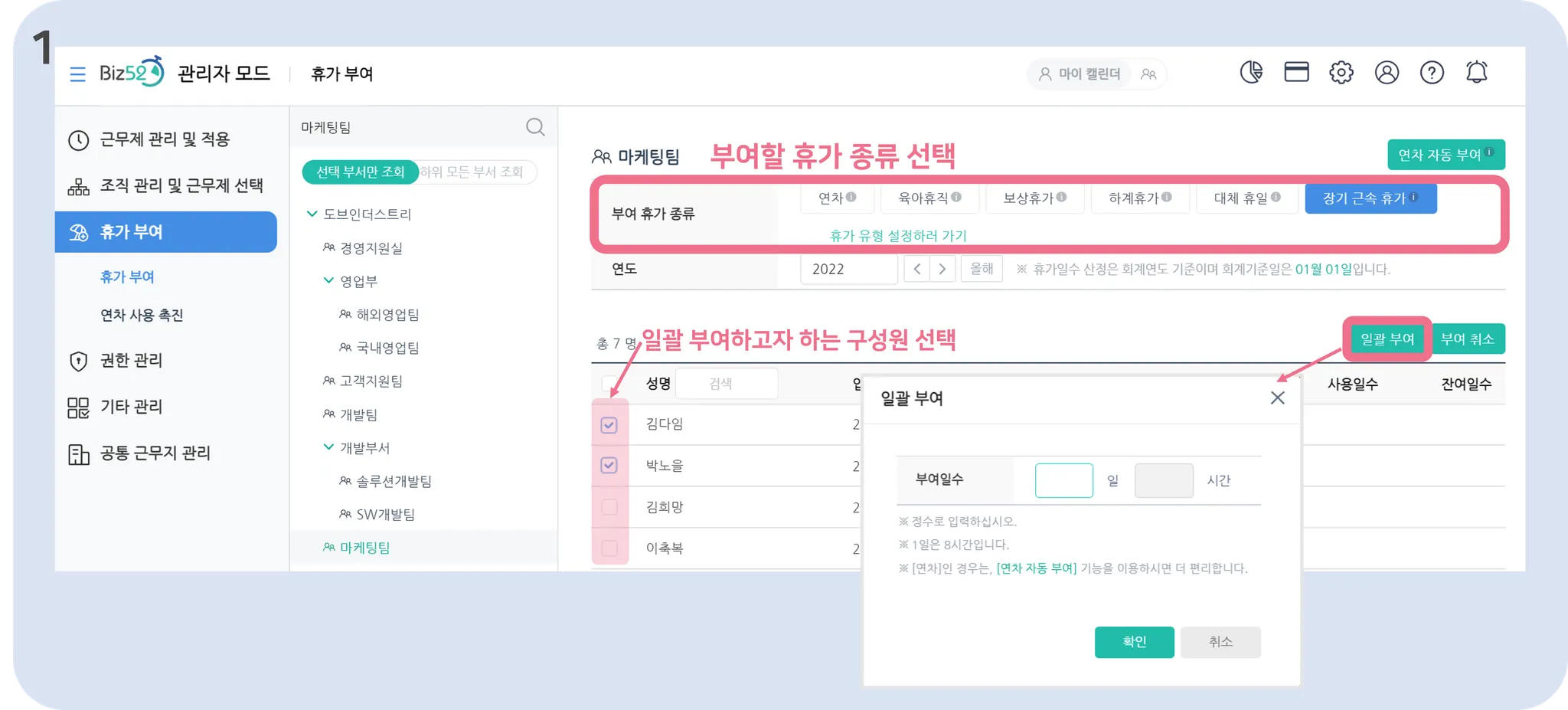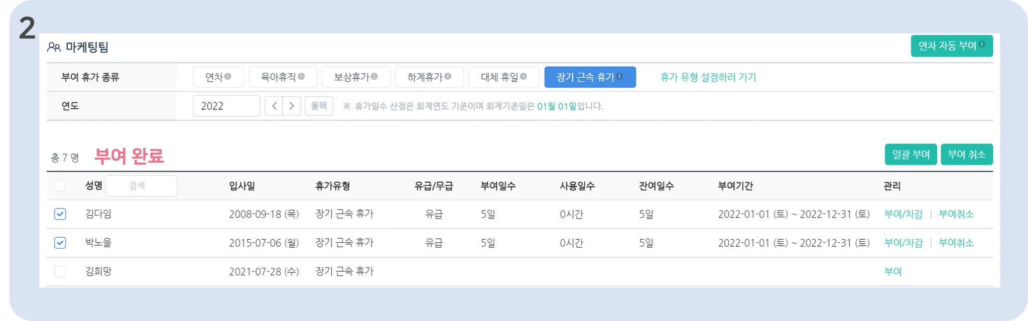 새로운 입사자들에게 최초 연차를 부여할 때, 새로 만든 우리 회사만의 휴가를 부여해야 할 때 등 구성원들에게 휴가를 일괄 부여해야 할 경우, 관리자모드 > 휴가 부여 > 일괄 부여를 활용하세요!