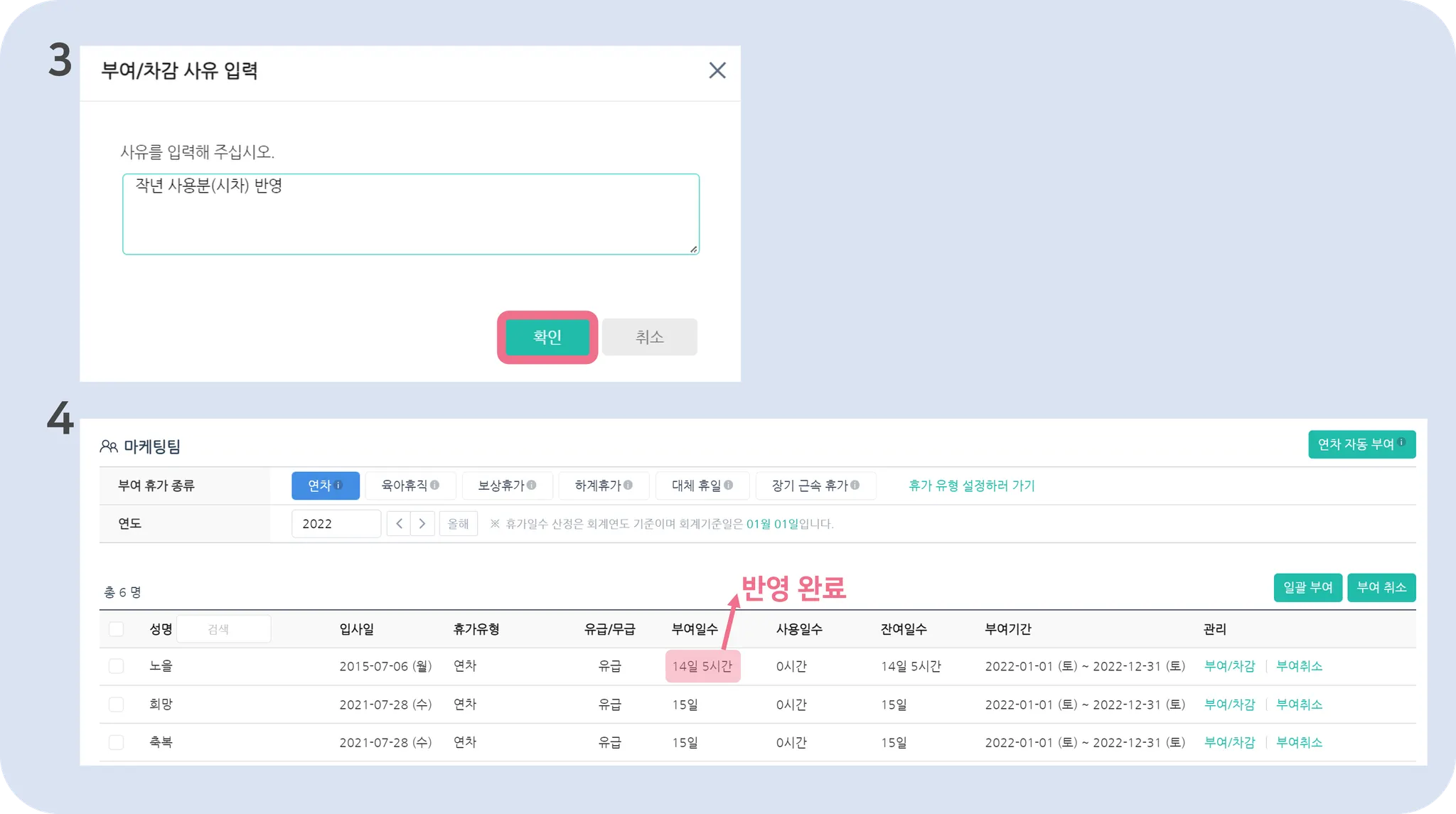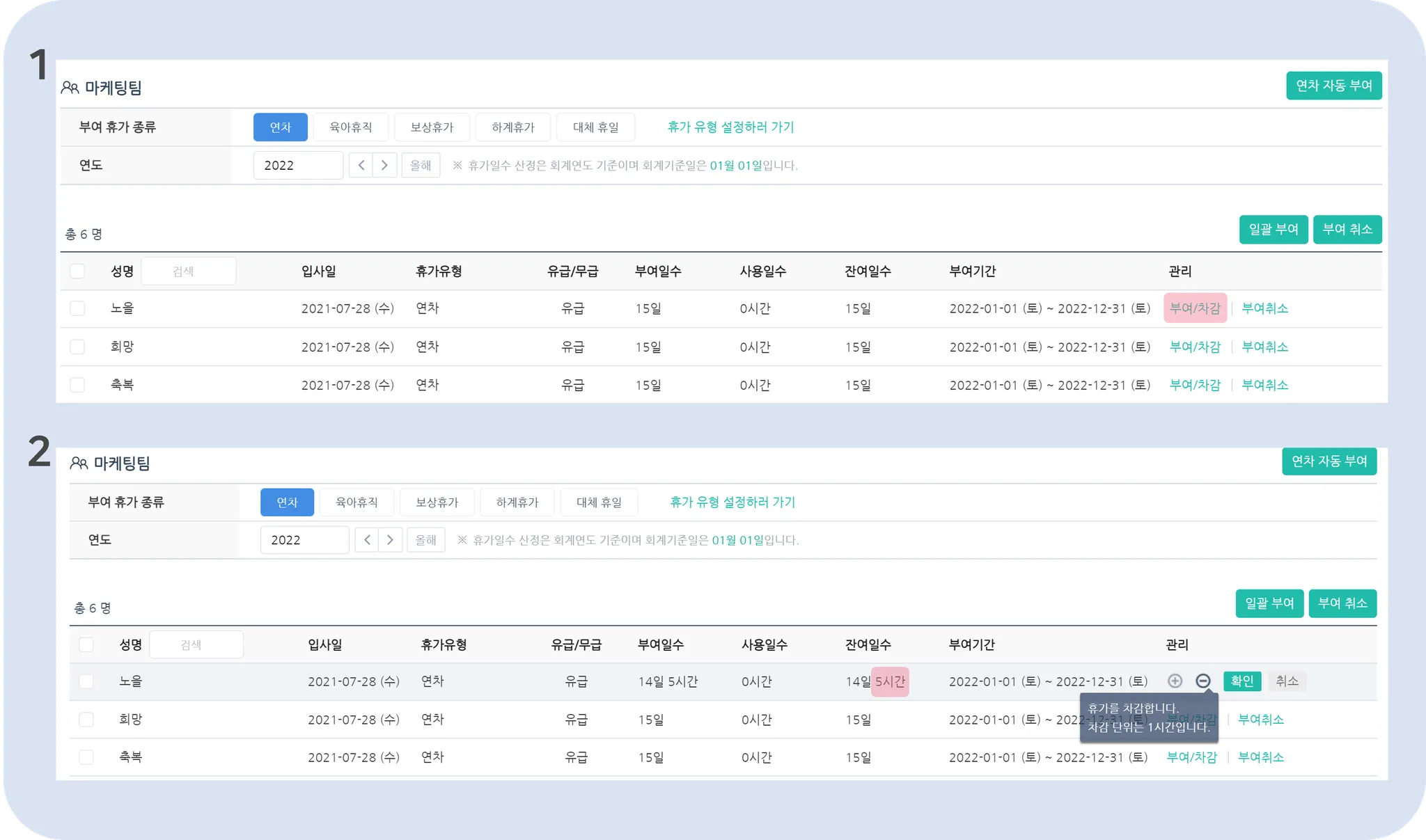 2) 차감은 시간 단위로 차감이 가능하나 부여 취소는 단위로 취소되지 않습니다.