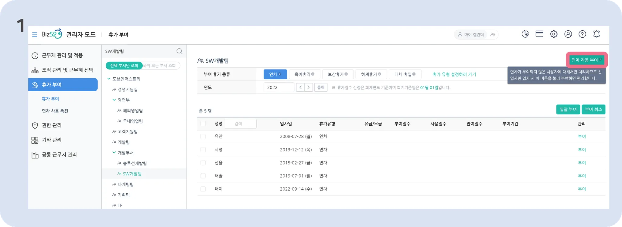 사용자 등록 당시 입력한 입사일을 기준으로 비즈가 연차를 계산해 부여합니다.