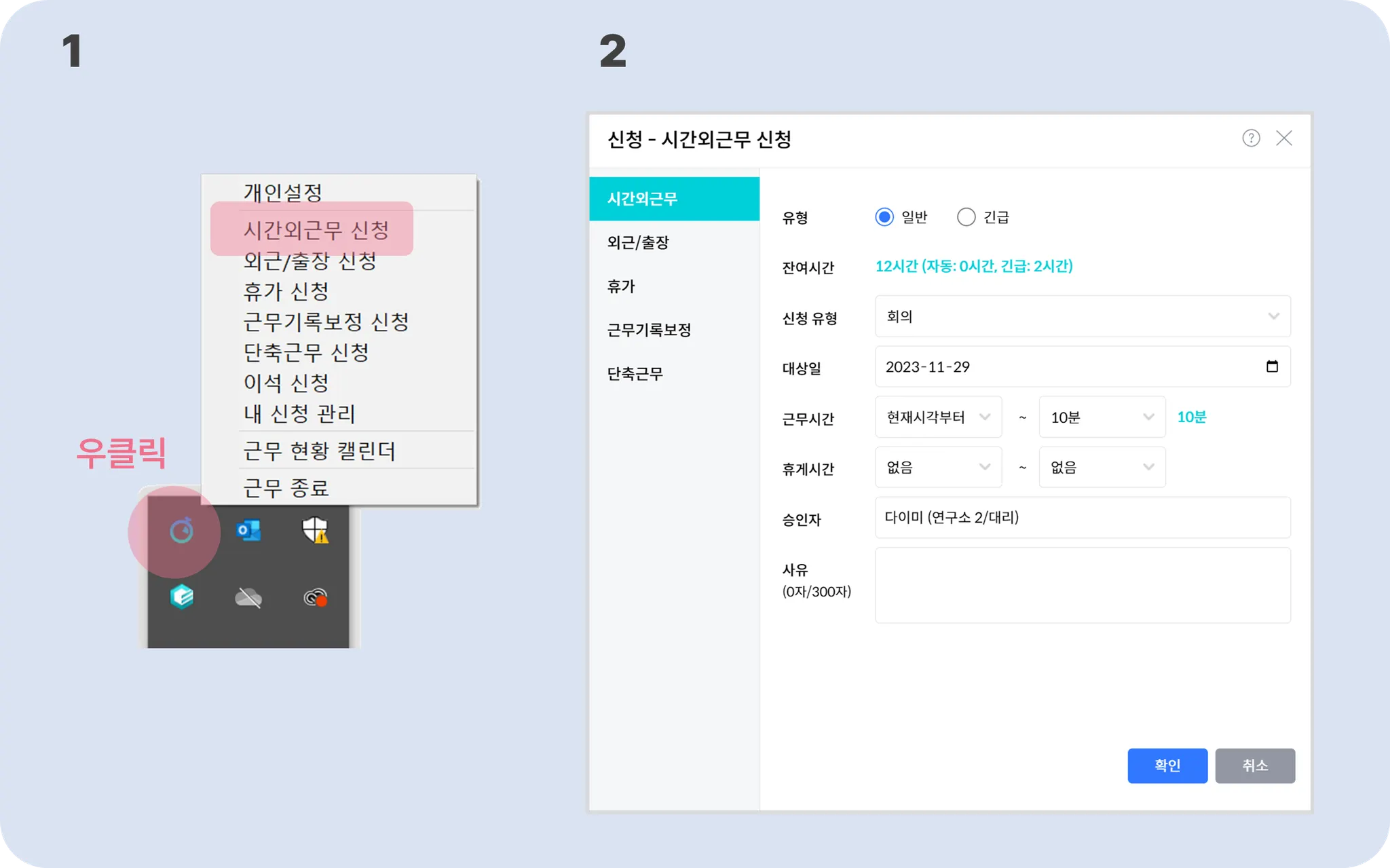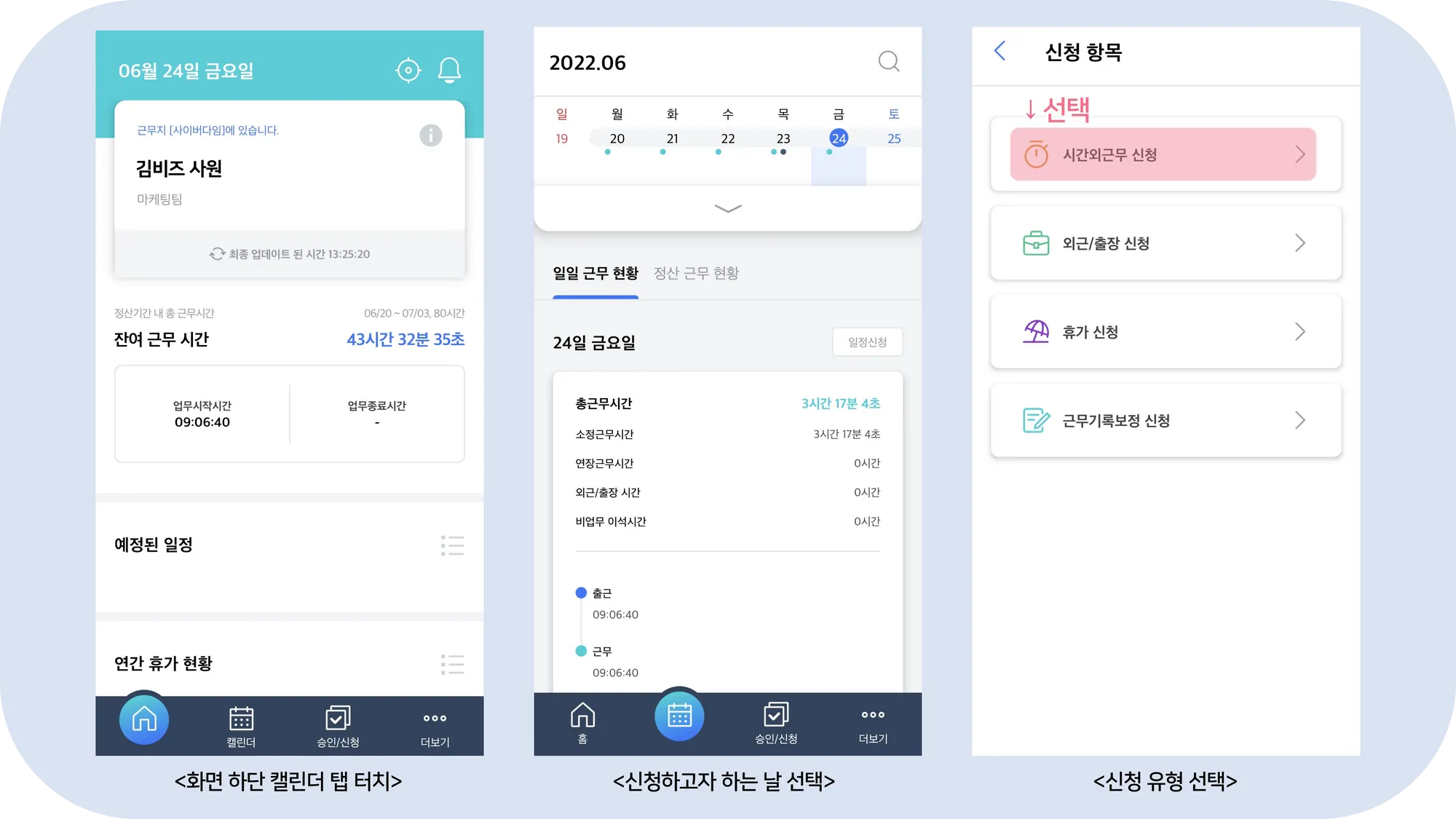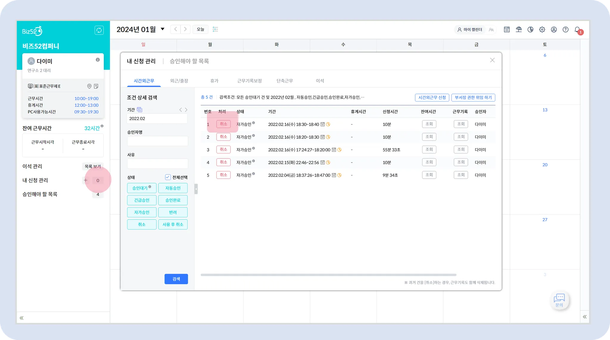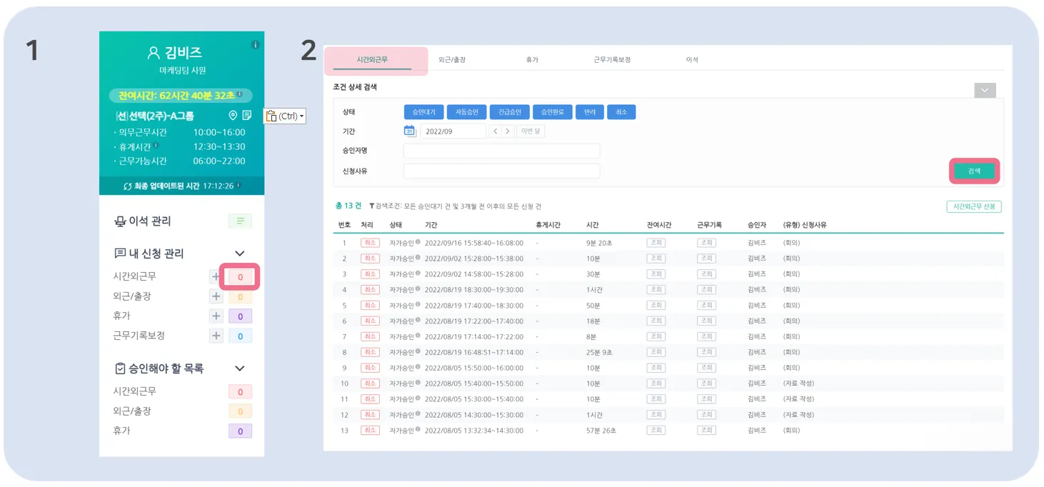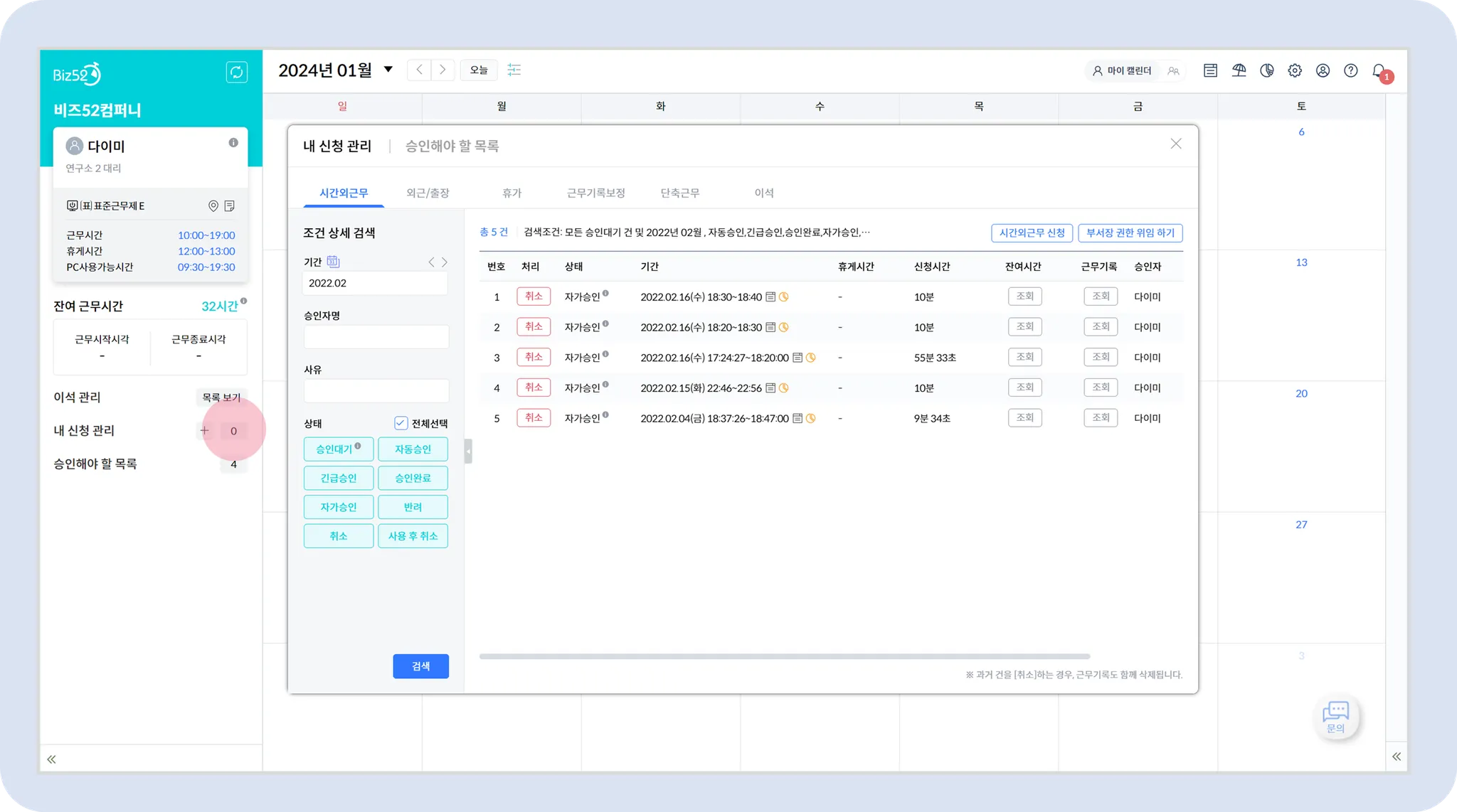 프리미엄 요금제 사용자는 Biz52 agent를 통해 손쉽게 시간외근무를 신청할 수 있습니다.