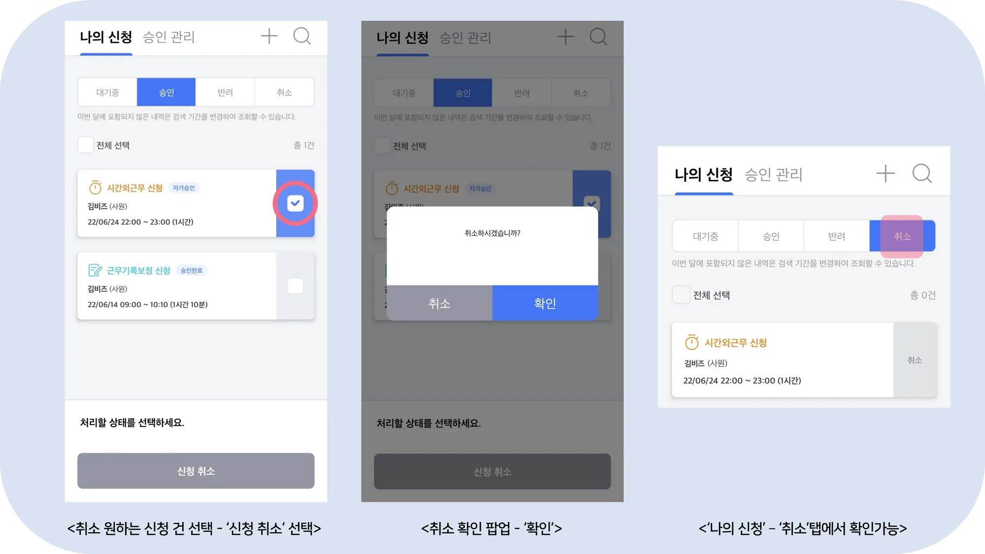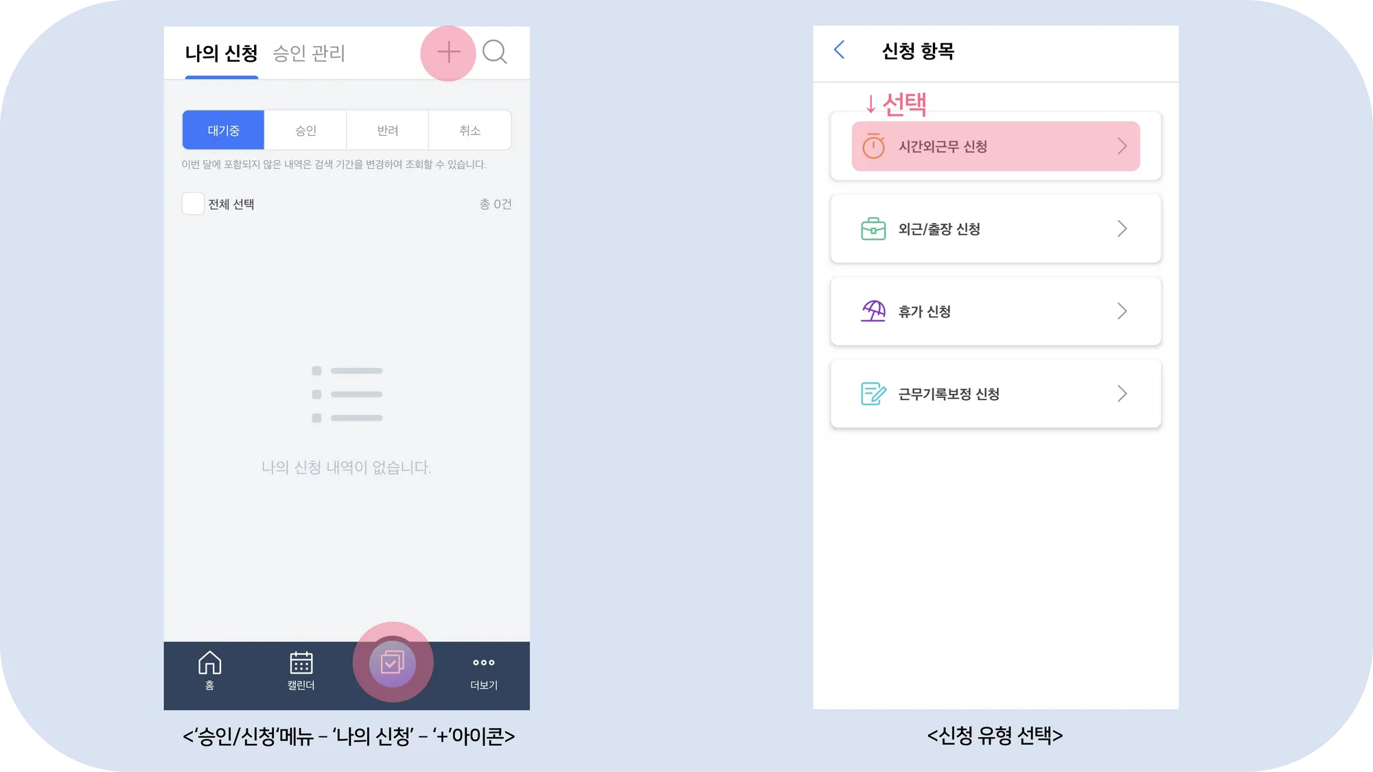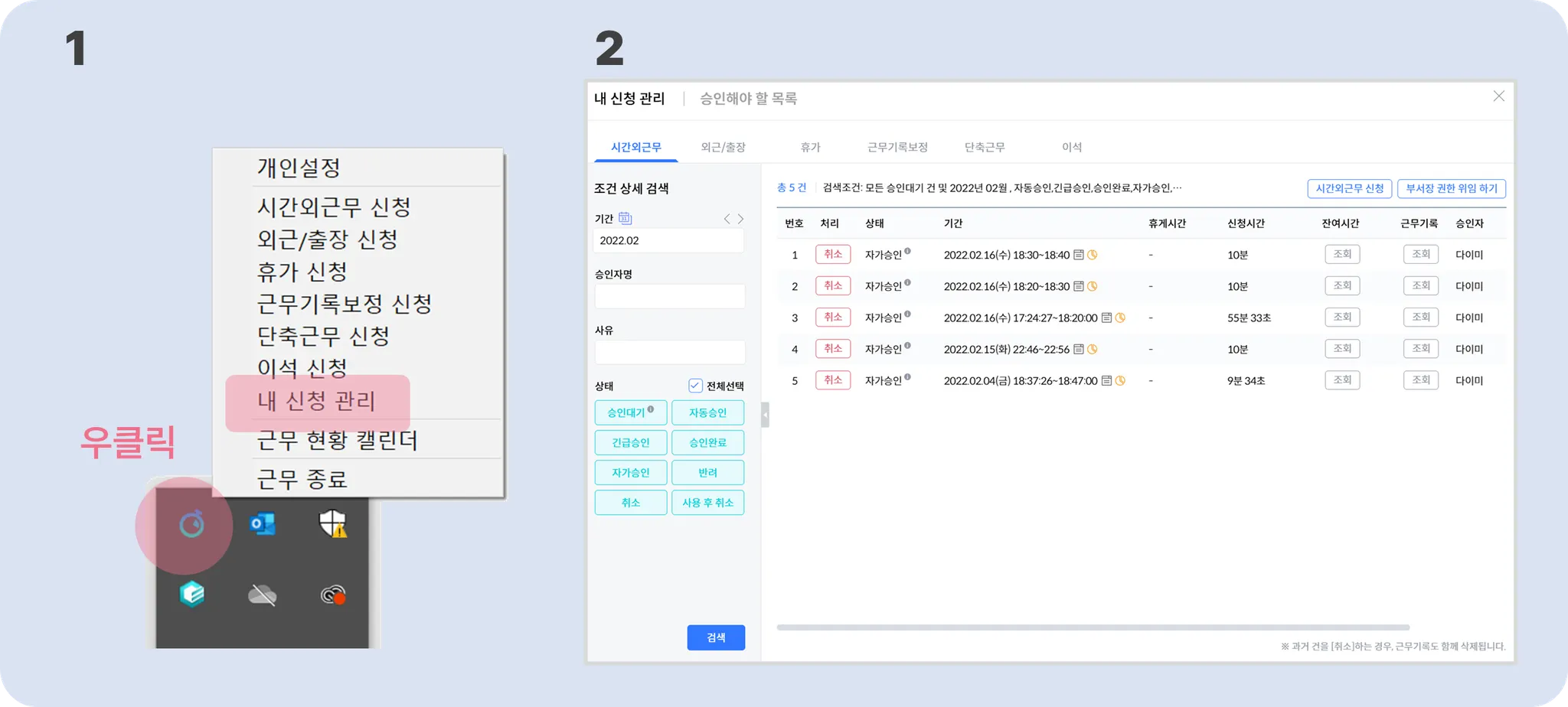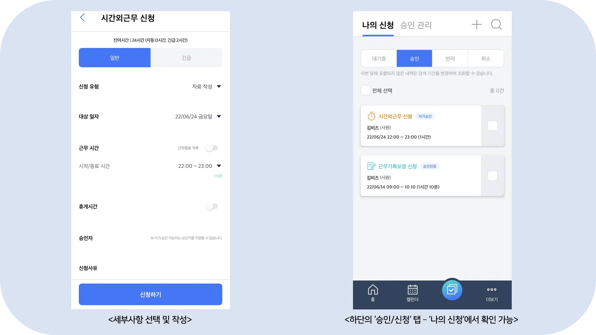 프리미엄 요금제 사용자는 Biz52 agent를 통해 손쉽게 시간외근무를 신청할 수 있습니다.